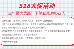 优惠团期:4月29日-5月4日、6月1日-6月27日、9月1日-9月25日