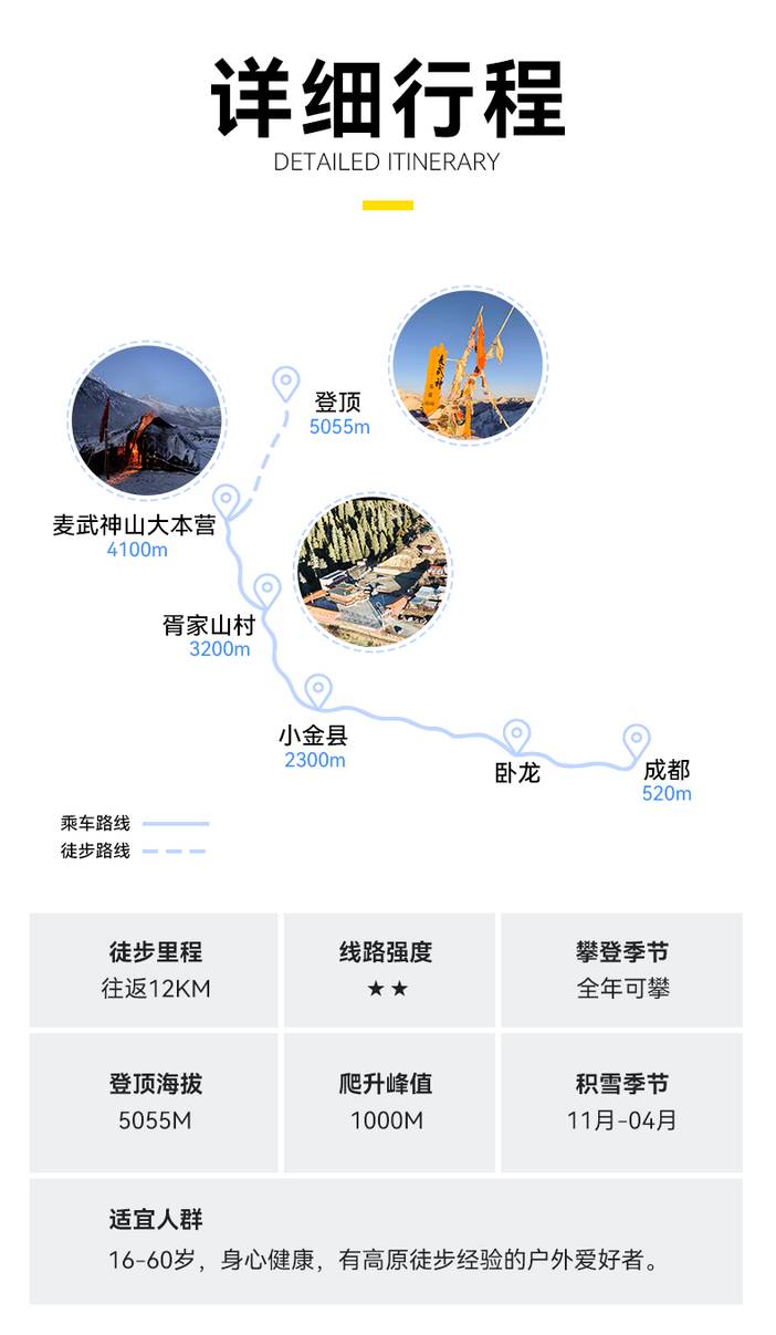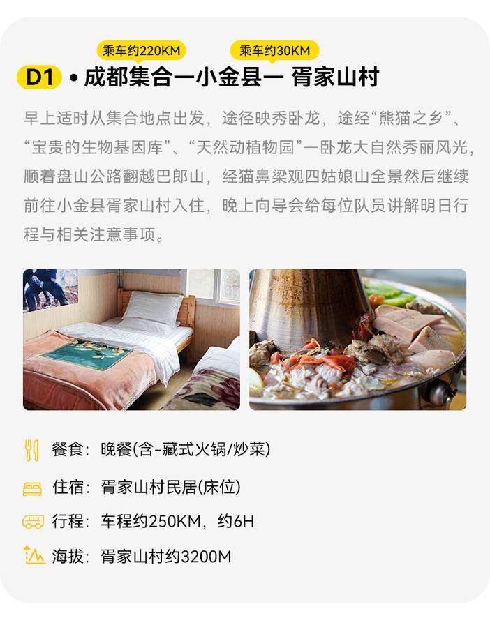 1.成都出发到小金县,集合时间大概10:00左右,具体以群通知位置,错过大巴车出发时间,需自费前往。