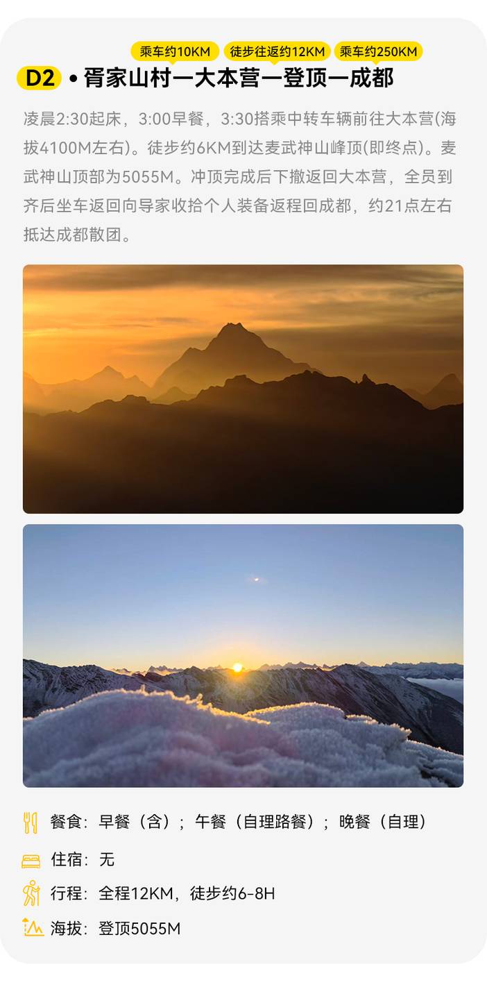 2.返程需要等待人员齐全才能出发,所以不管提前下来多久,都需要等待大部队一起出发。出于安全考虑,大部队将16:00左右出发返回成都。