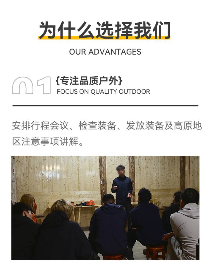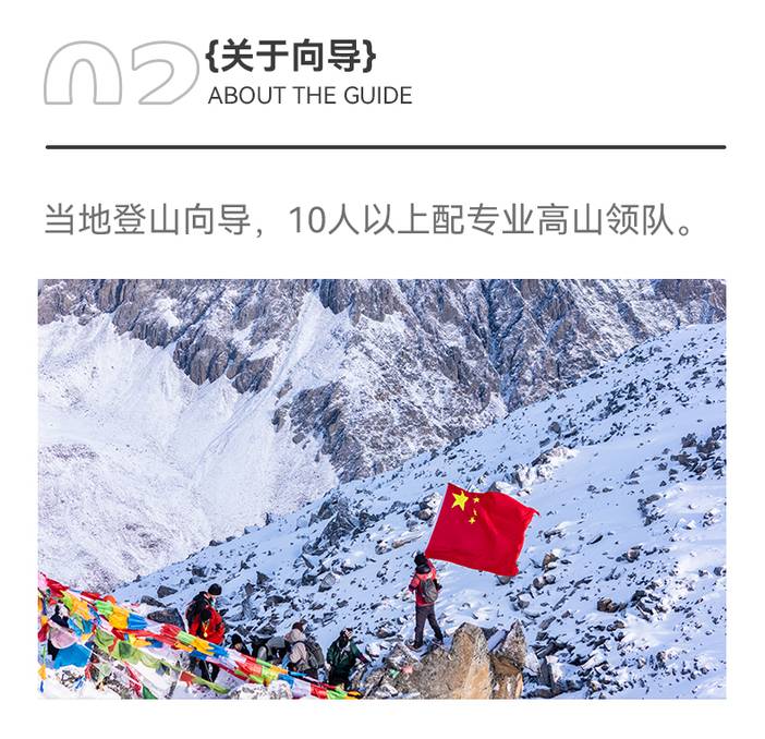 4.向导:专业登山向导带队,10人以上配专业高山领队全程跟队。