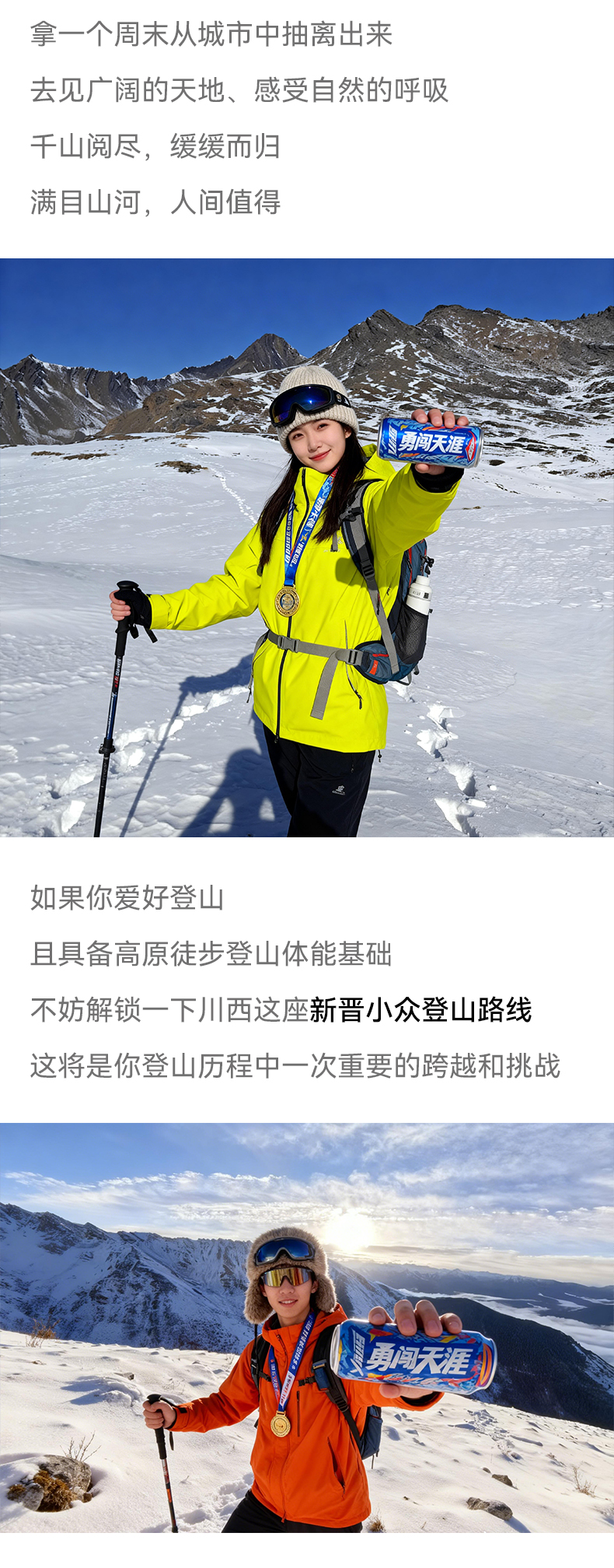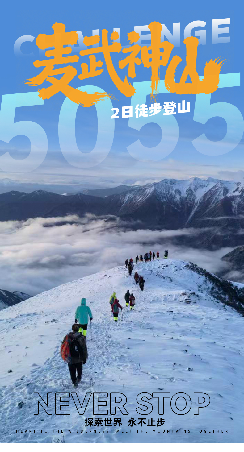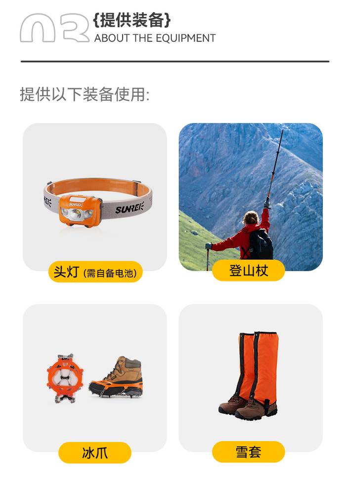 提供装备使用:冰爪+雪套+登山杖+头灯(需自备电池)。